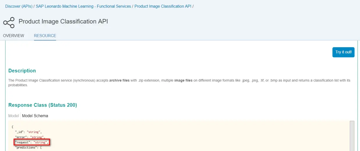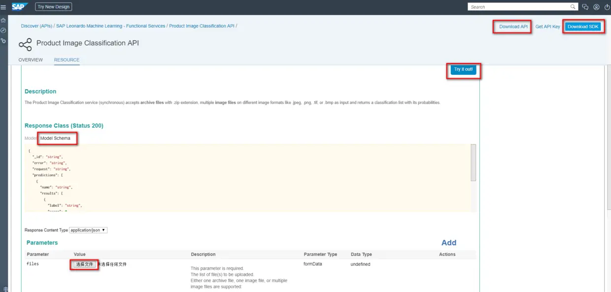 会看到如下界面。该界面包含了这个API的Model Schema介绍,即您调用API之后,返回的响应结构里包含哪些字段,以及对应的类型(对象或者数组)。界面里包含了一个小型的API调用控制台,您可以直接控制台里选择一个本地图形文件,然后点击Try it out按钮来体验一下API的效果。