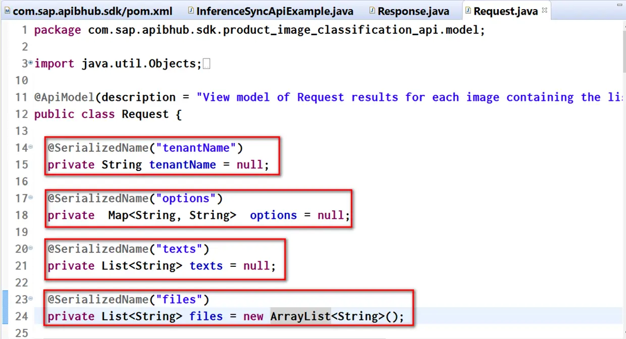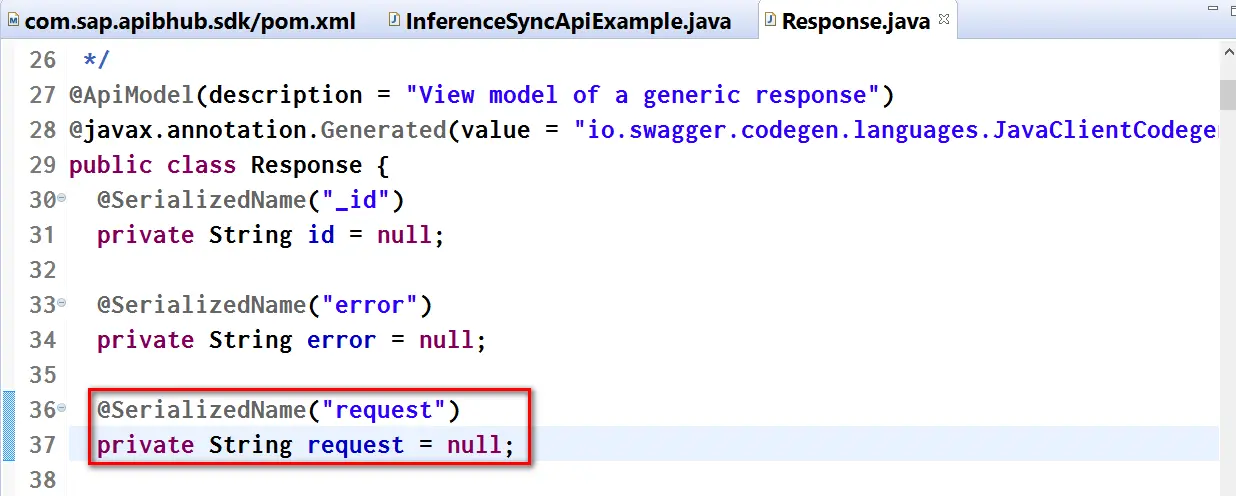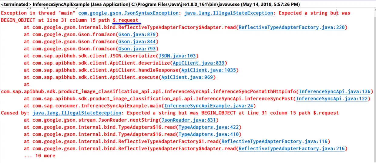 从http://api.sap.com下载的SDK里的代码,Gson容器类Response.java里声明的request字段类型为String,而非对象,因此Gson会抛异常:Expected a string but was BEGIN_OBJECT at line 31 column 15 path $.request