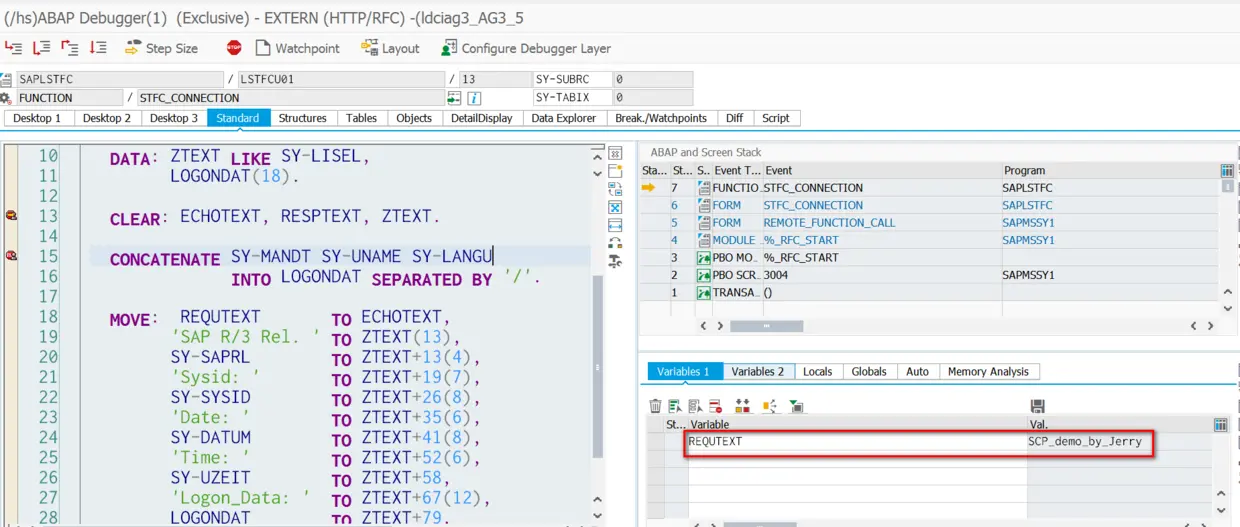 (1) 第28行根据Destination名称拿到其实例,名称在第2步SAP云平台的配置里指定。 (2) 第31行,拿到ABAP函数STFC_CONNECTION的句柄。 (3) 第35行,拿到用户从浏览器url里传进来的输入值。 (4) 第38行,将从第35行拿到的用户输入赋给STFC_CONNECTION的输入参数REQUTEXT。 (5) 第42行,执行ABAP函数。 (6) 第45, 46行,得到ABAP函数执行结果。