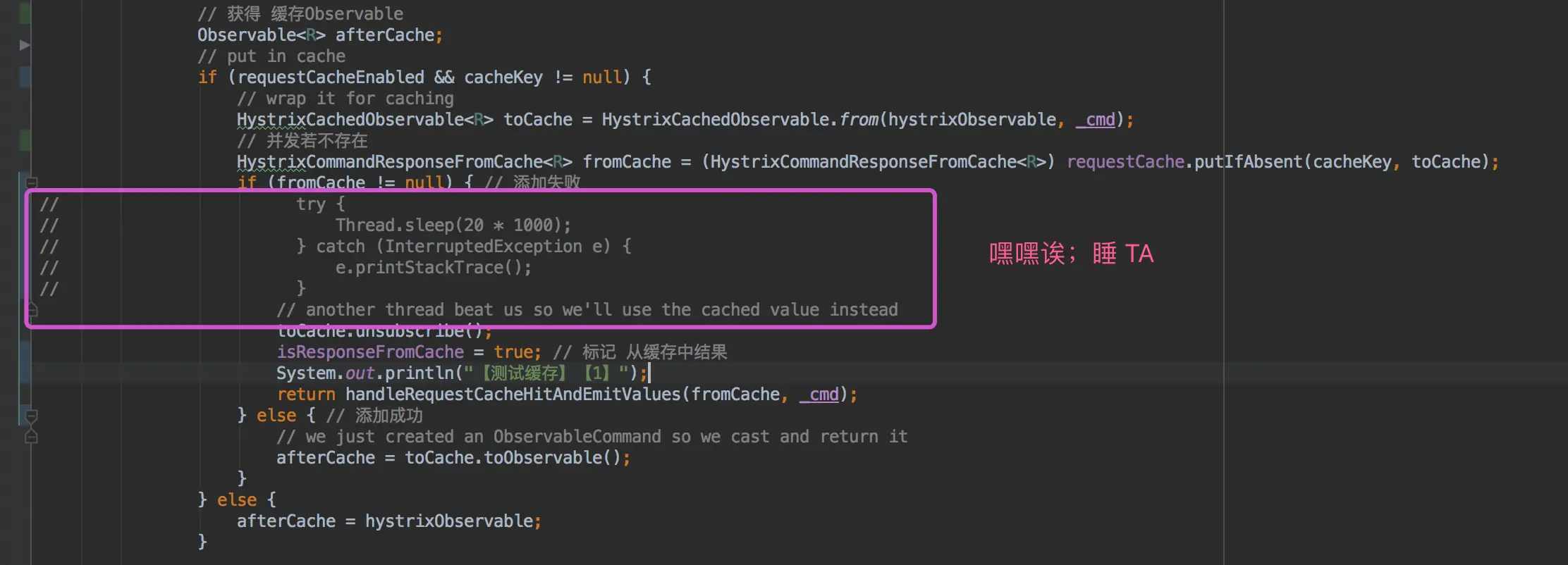 SEMAPHORE隔离时,#subscribe(replaySubject)调用完成时,实际命令已经执行完成,所以即使AbstractCommand#toObservavle(...)的第 75 行 :调用HystrixCommandResponseFromCache#unsubscribe()方法,也会浪费,重复执行命令。而对于THREAD隔离的情况,通过取消订阅的方式,只会执行一次命令。当然,如果“恶搞”THREAD隔离的情况,增加sleep的调用如下,就能达到重复执行命令的效果。