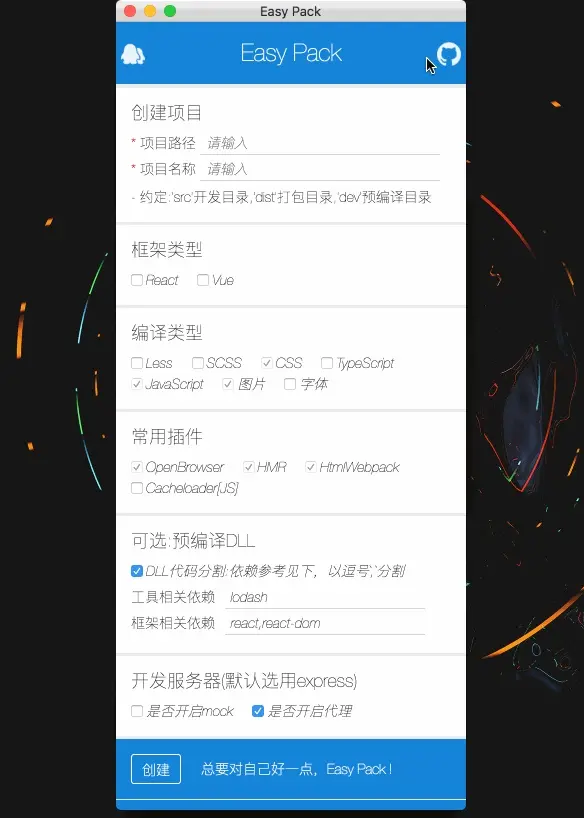 - 总是觉得 webpack 不够彻底,如果从常规使用,就应该把 css,js,图片,hmr 这些常规的默认集成起来。所以 easypack 默认已经把这些勾选了。生成的配置文件其实可以读读看,想要二次增删还是比较方便的。