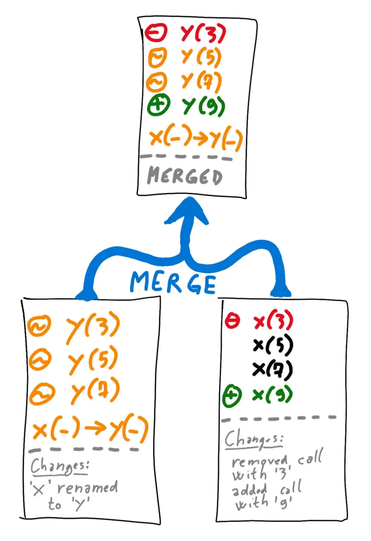 Typical non-trivial merge: the changes on the right relies on code that has been changed on the left