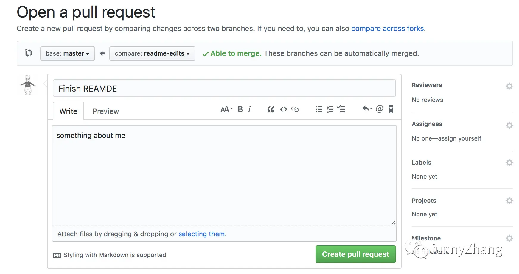 点击之后,给出本次 Pull Request 的 title 和描述。