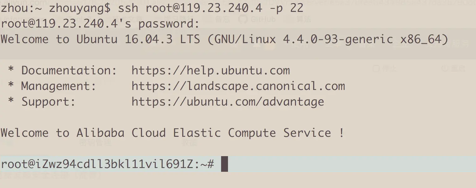 - 打开命令行窗口 输入 ssh root@119.23.240.4 -p 22 输入服务器时输入的密码.输入密码时光标是不动的 (忘记密码的话,可以在管理控制台=>服务器运维=>远程连接=>设置密码)