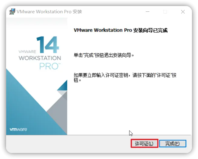 如何你选择的是 VMware Workstation Player,那么点击完成就可以了,如果选择的是 VMware Workstation Pro ,请点击许可证