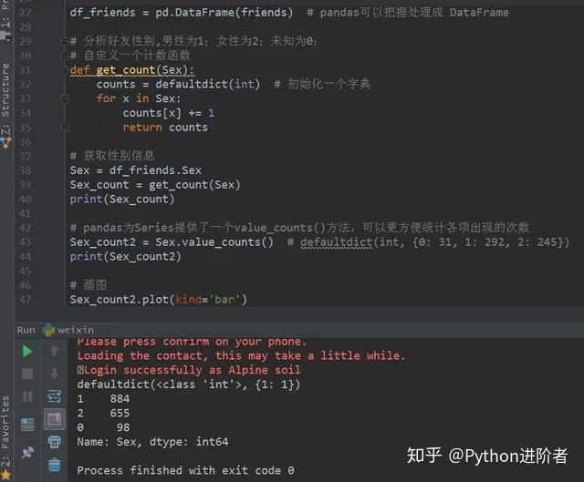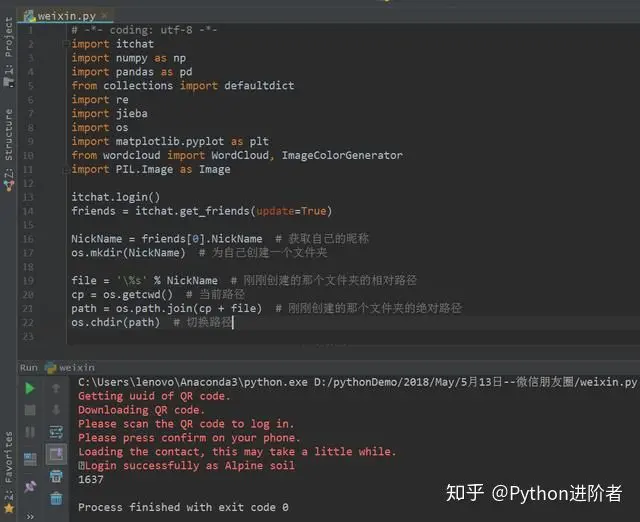 关键部分的代码,都有注释,方便大家理解。当程序运行的时候,会弹出一个微信二维码,此时需要用手机扫码授权登录。如果您当时正在微信电脑版上登录的话,此时微信会强制退出,然后进行授权。授权成功之后,程序会继续往下执行,稍等片刻之后,便可以给您返回您的微信好友数量信息。