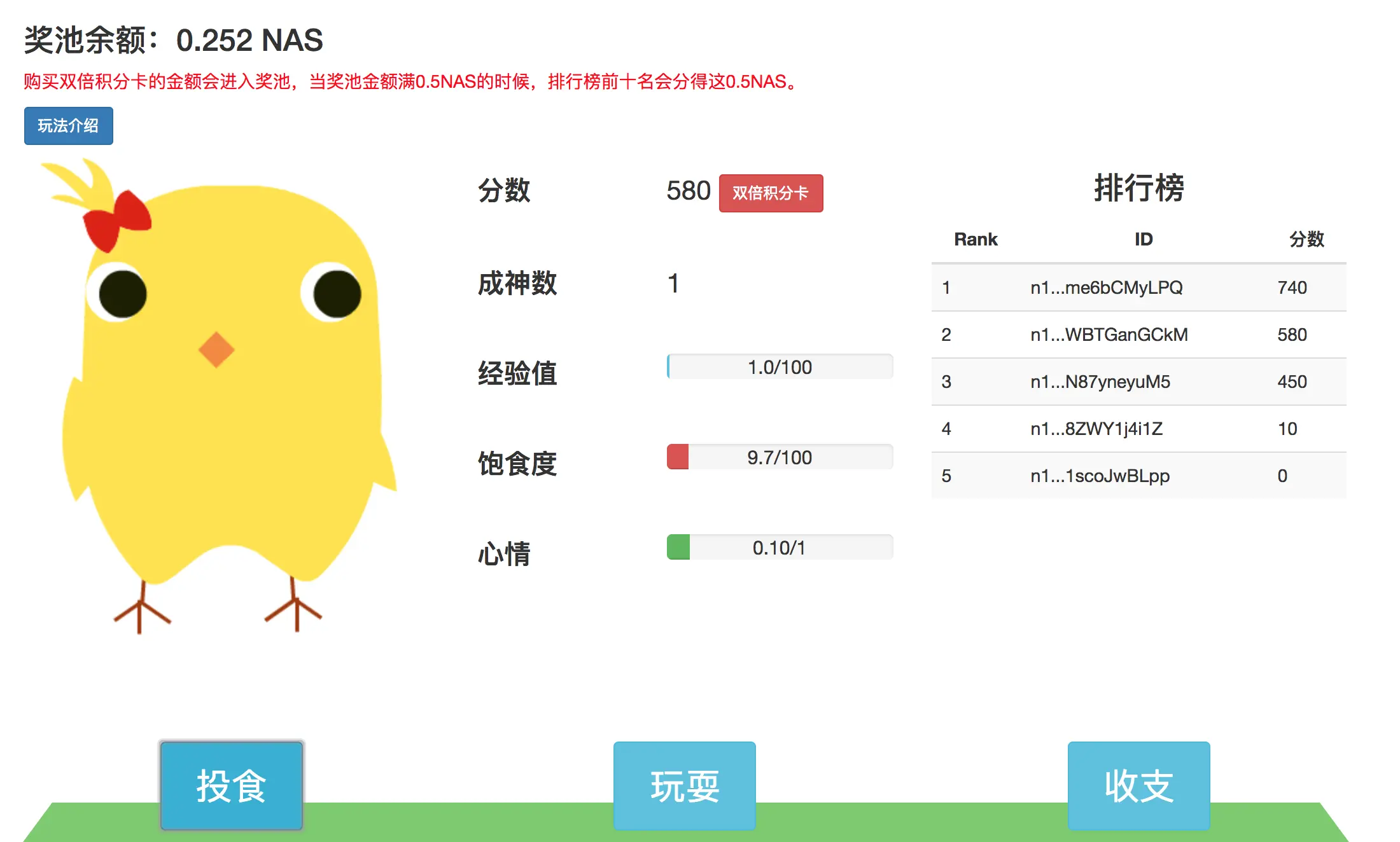 之后,只需要对宠物进行喂食,玩耍,当分数处于排行榜内,且购买双倍积分卡的金额大于0.5NAS的时候,则会向排行榜分发这些NAS哦~~