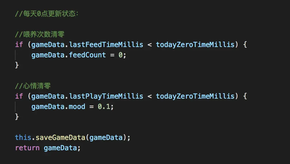 其次更新一下游戏状态,也就是存储数据,并且每天12点会重置心情值: