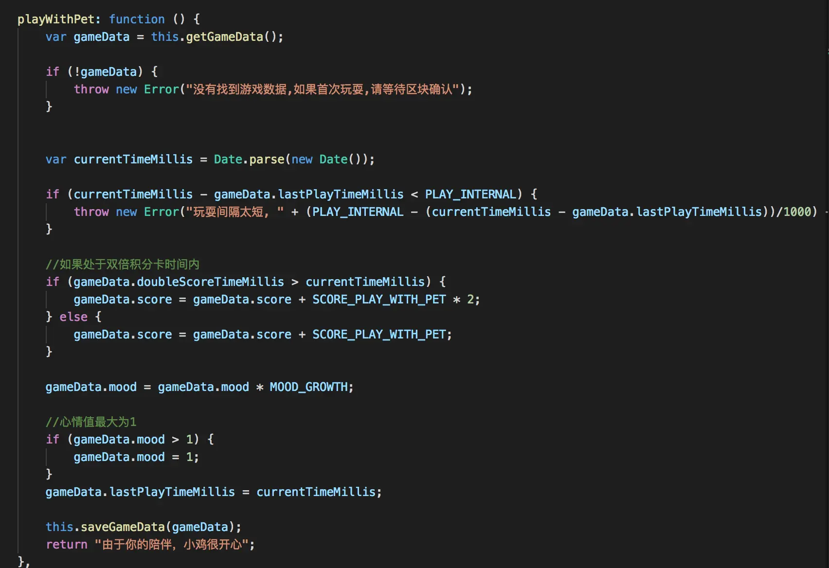 接下来,需要完成一系列行为,首先是玩耍。 玩耍主要有几点,第一点是玩耍的间隔判断,所以这里根据玩耍间隔和上次玩耍时间来计算。 另外如果处于双倍积分卡内,则获得的积分将会*2,心情的最大值为1.