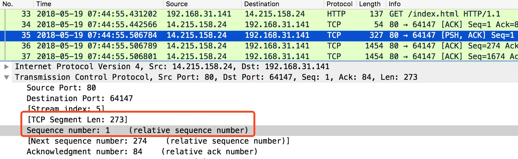 1.1、服务端->客户端:Seq=1,TCP数据长度273。也就是说,服务端发送的报文段中,第一个数据字节的序号是1;下一个TCP报文段,第一个数据字节的序号应该是274。