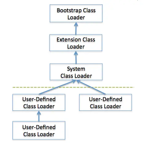该模型要求除了顶层的 Bootstrap class loader 启动类加载器外,其余的类加载器都应当有自己的父类加载器。子类加载器和父类加载器不是以继承(Inheritance)的关系来实现,而是通过组合(Composition)关系来复用父加载器的代码。每个类加载器都有自己的命名空间(由该加载器及所有父类加载器所加载的类组成,在同一个命名空间中,不会出现类的完整名字(包括类的包名)相同的两个类;在不同的命名空间中,有可能会出现类的完整名字(包括类的包名)相同的两个类)