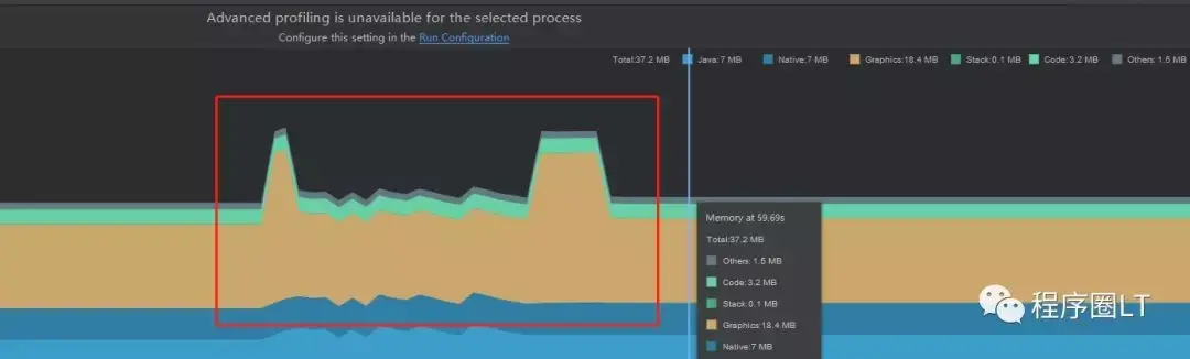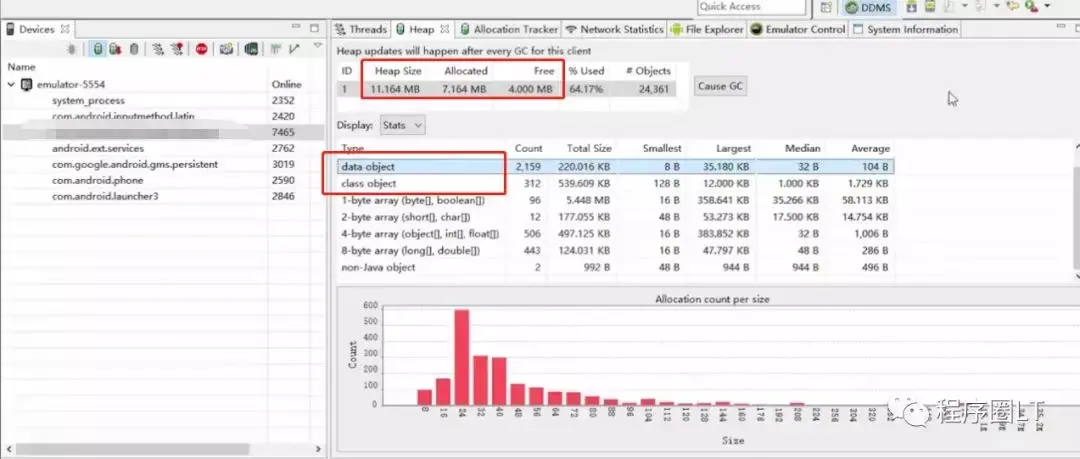 这也是看我们的APP的内存使用情况,标记了的假如你的APP在运行的时候 data object和 class object 不断的变化,那就说明你的应用可能有内存泄露了,这个时候你就需要检查一下。