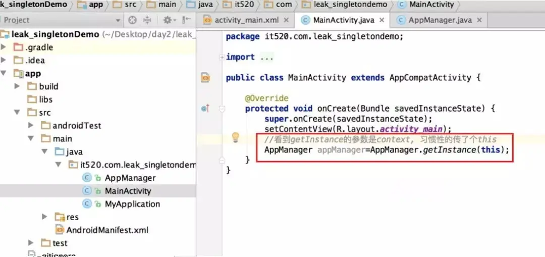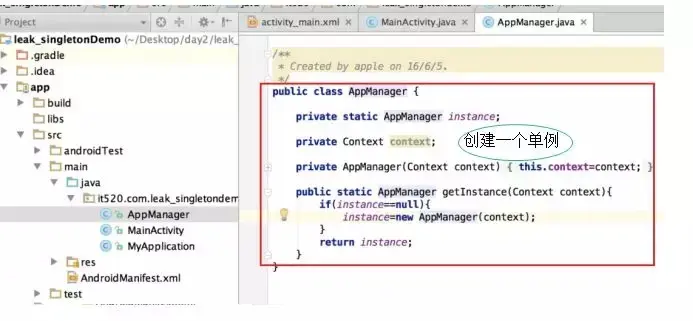 AppManager appManager=AppManager.getInstance(this) 这句传入的是Activity的Context,我们都知道,Activty是间接继承于Context的,当这Activity退出时,Activity应该被回收, 但是单例中又持有它的引用,导致Activity回收失败,造成内存泄漏。 像这种情况我们应该怎么避免呢? 我们将传入的this改成getApplicationContext(),因为我们Application的生命周期是和APP的生命周期一直的所以就不存在内存泄露的问题。