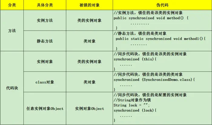 如图,synchronized可以用在方法上也可以使用在代码块中,其中方法是实例方法和静态方法分别锁的是该类的实例对象和该类的对象。而使用在代码块中也可以分为三种,具体的可以看上面的表格。这里的需要注意的是:如果锁的是类对象的话,尽管new多个实例对象,但他们仍然是属于同一个类依然会被锁住,即线程之间保证同步关系。