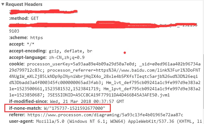 - If-None-Match是客户端再次发起该请求时,携带上次请求返回的唯一标识Etag值,通过此字段值告诉服务器该资源上次请求返回的唯一标识值。服务器收到该请求后,发现该请求头中含有If-None-Match,则会根据If-None-Match的字段值与该资源在服务器的Etag值做对比,一致则返回304,代表资源无更新,继续使用缓存文件;不一致则重新返回资源文件,状态码为200,如下。