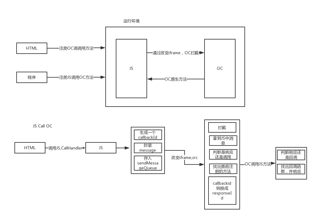 来调用 JS 中_handleMessageFromObjC中的方法,把相关的参数一起带上,JS解析OC传过来的字段通过 判断 responseId 的有无来判断是call还是reponse(回应),并从messageHandlers取出提前注册的JS方法中的block,回应之后在通过改变iframe src的形式,同时把callbackId改成responseId回传给OC,OC拦截到之后,在去比较执行,在响应。 整体流程图如下: