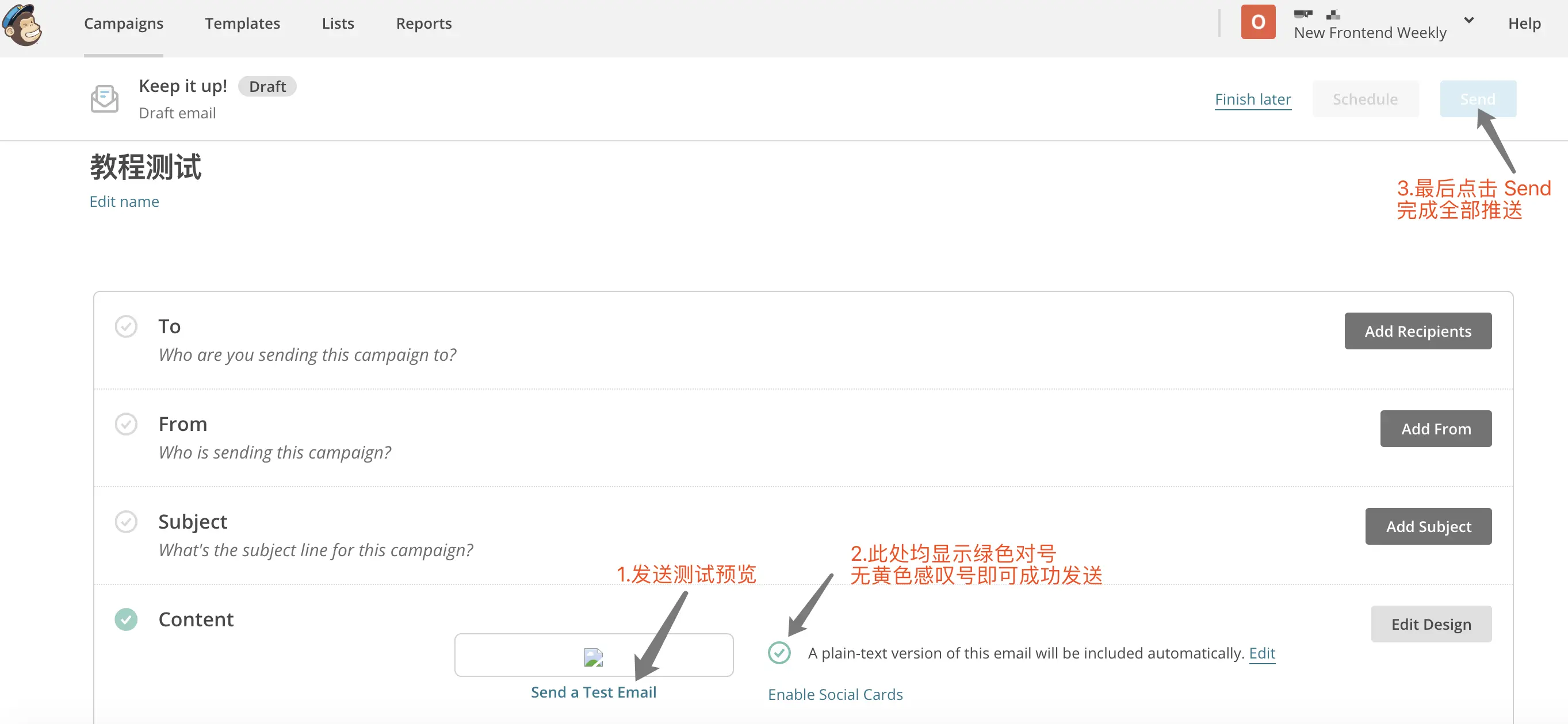 全部设置完成后,,发送最后一次测试预览,检查后无问题点击 「 Send 」完成发送。