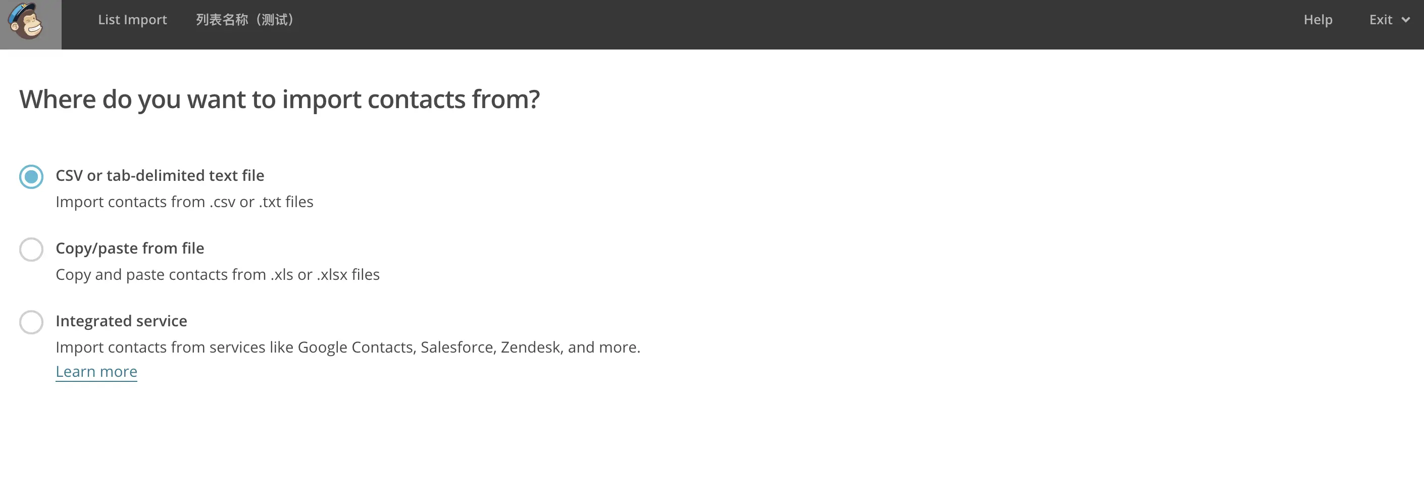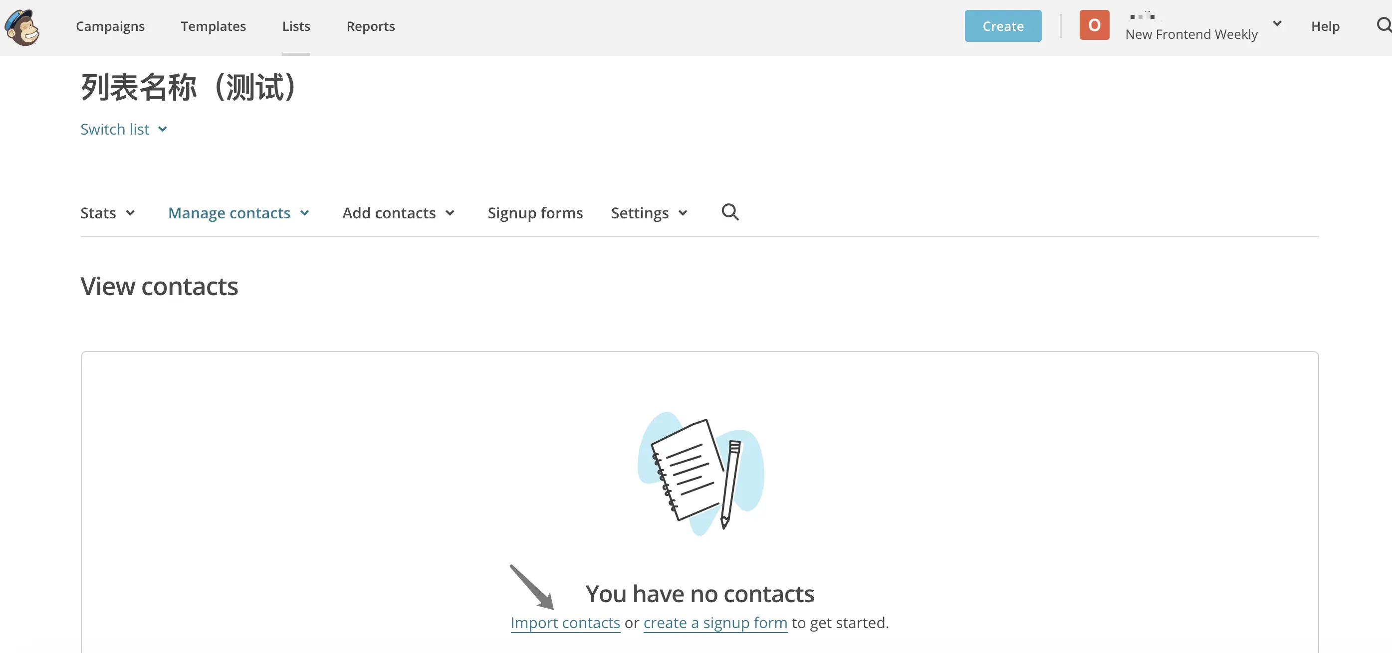 左上方「 List 」- 「 Greate List 」创建一个新的邮箱列表,「 Import contacts 」导入发送添加发送邮箱列表,列表支持 csv、xls、xlsx等文件批量上传。
