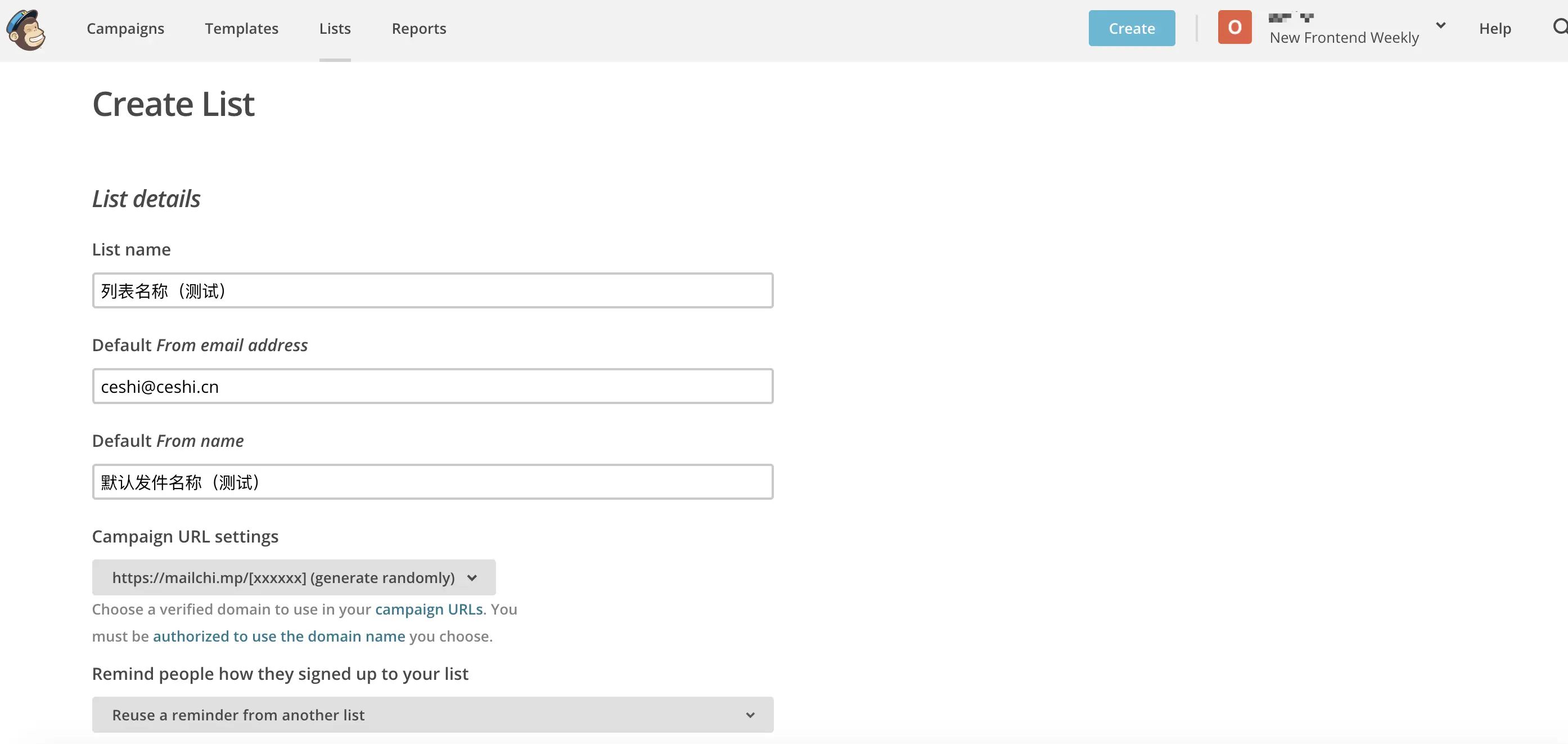 建立 List name 列表名称(此部分仅展示给创建人)、发件地址(此处会展示在用户收件中,可以不是注册 Mailchimp 账号的邮箱) 、发件人名称,点击保存。