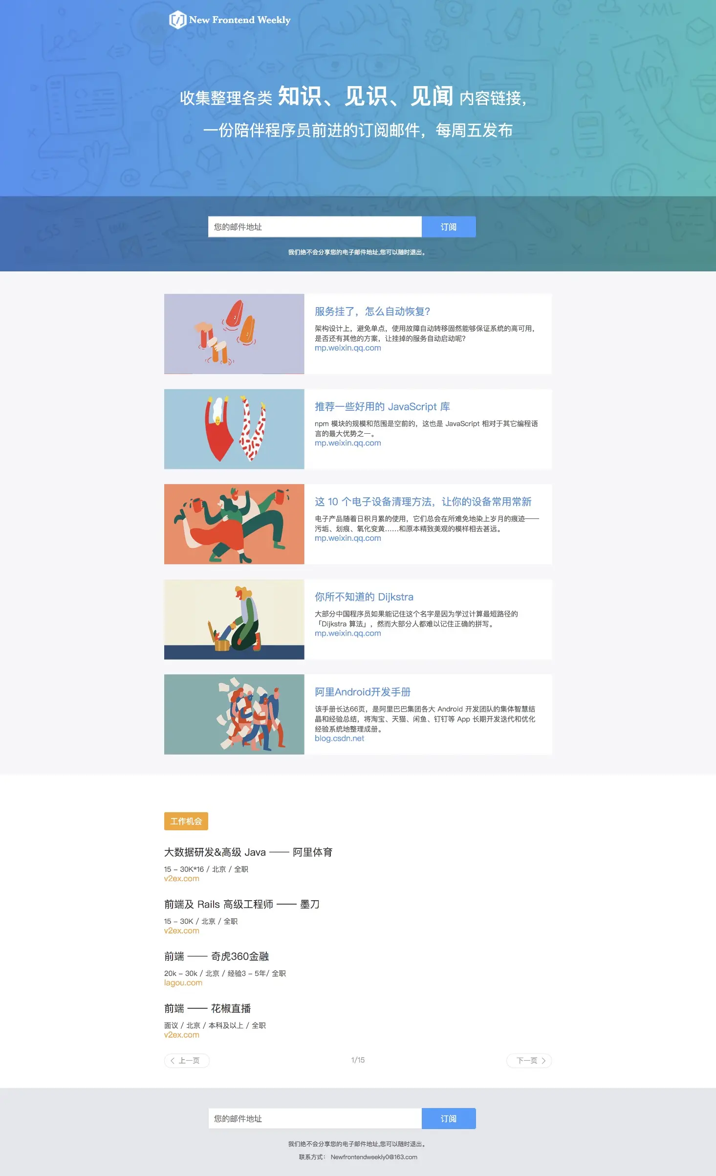 基于平时爱好关注各类技术社区及众多技术微信号,经常看到很多有用有意思的内容,朋友总是让分享出来,索性就抽空做了个邮件订阅页面( http://nextfe.com ),目前每周发一次,内容偏向于前端但不限于此范围,所以取名《新前端周刊/ New frontend Weekly 》。