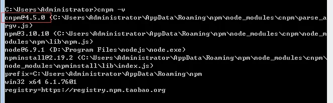2、安装淘宝镜像,打开命令行工具,把这个(npm install -g cnpm --registry= registry.npm.taobao.org)复制(这里要手动复制就是用鼠标右键那个,具体为啥不多解释),安装这里是因为我们用的npm的服务器是外国,有的时候我们安装“依赖”的时候很很慢很慢超级慢,所以就用这个cnpm来安装我们说需要的“依赖”。安装完成之后输入 cnpm -v,如下图,如果出现相应的版本号,则说明安装成功。