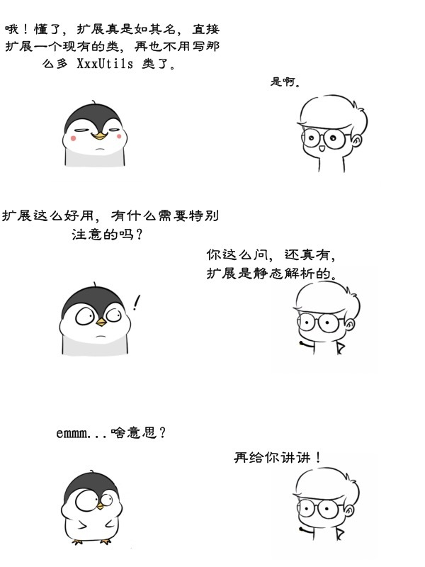 这也印证了扩展是依据调用所在的表达式类型来决定的,而不是由表达式运行时的类型决定的。