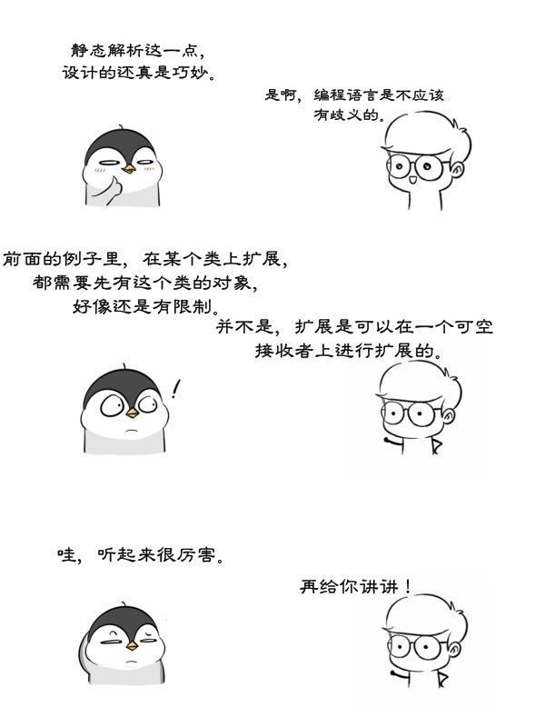 这里强调的扩展是静态解析的,即他们不是根据接受者类型的虚方法来判定调用那个方法。