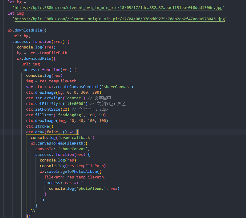 - wx.saveImageToPhotosAlbum() //将文件保存到本地相册,注意要在图片生成的回调函数中执行