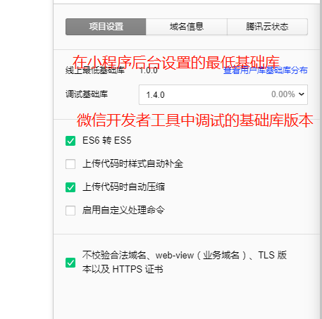 目前小程序开发文档中很多的组件都是基于版本库最低1.4.0的,所以建议设置线上最低基础库为1.4.0
