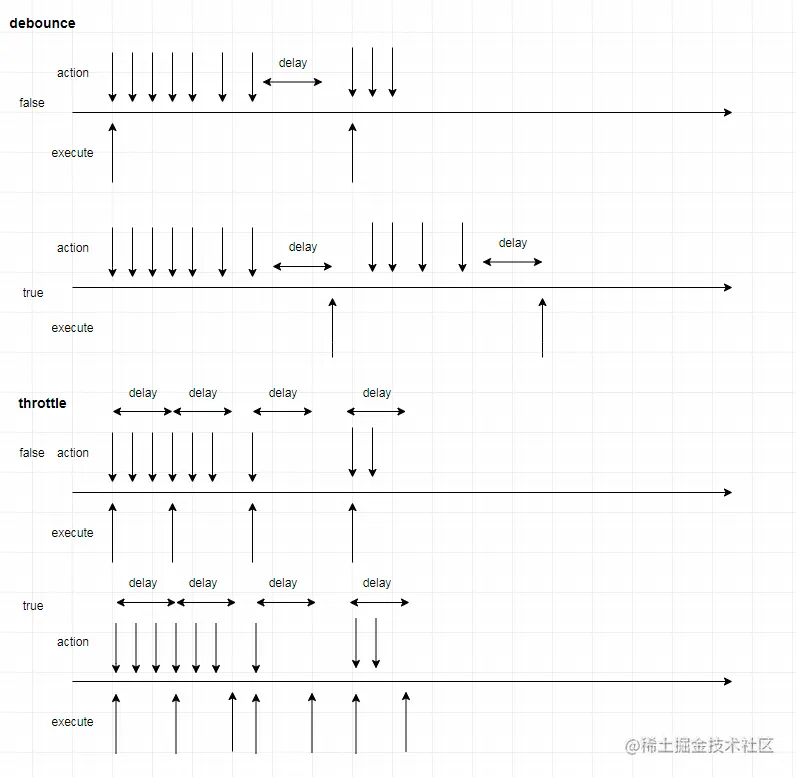 在immediate为false的情况下,第一次触发动作,函数就马上被执行了,在这次执行后,在后续的delay时间段内触发动作都不会执行函数,间隔大于delay后,回到初始状态,触发动作函数就执行。
