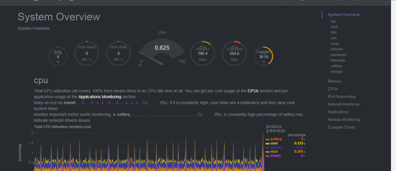 最终在各种系统对比的过程中,选择了netdata这个工具,当然有一些软件比如:zabbix,negios等等都是可以的,但是我们服务器压力不算大,最终采用了更加轻量级的解决方案。