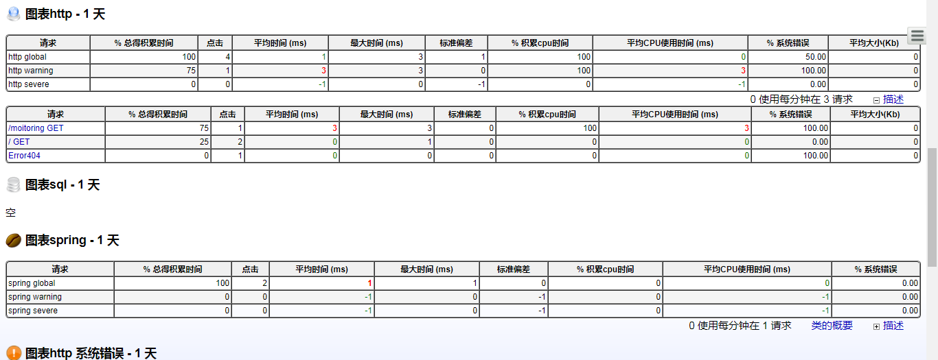 - http请求、sql请求、jsp页面与业务接口方法(EJB3、Spring、 Guice)的执行数量,平均执行时间,错误百分比等