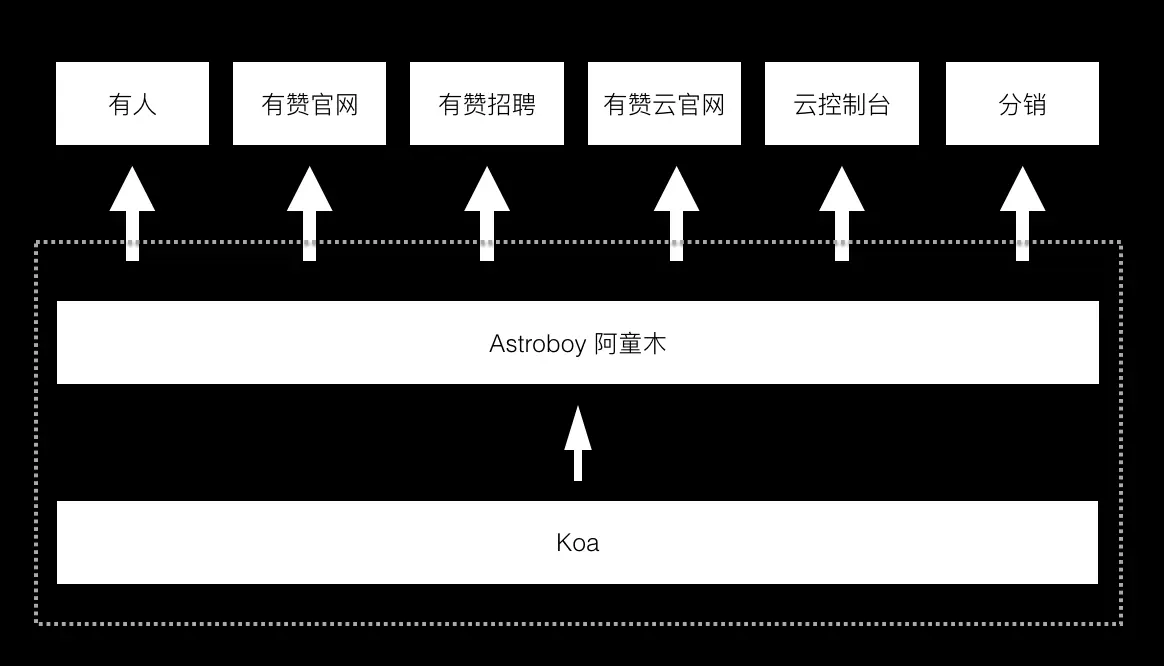 项目多了之后,这种方式弊端很快就显现出来了,因为模板代码和业务代码是耦合在一起,如果要改模板生成的代码,只能每个项目手动更新,而随着时间的推移,越来越难保持同步了,每个项目的目录结构和代码风格可能也会变得非常不一样,所以,解耦框架代码和业务代码就非常重要了。所以我们就在脚手架模板的基础上抽离出了一个框架叫 Astroboy(阿童木),这个框架是在 Koa 的基础上封装的,这样,每个项目都基于这个框架开发,如果框架更新了,项目也只需要更改下框架的版本号。