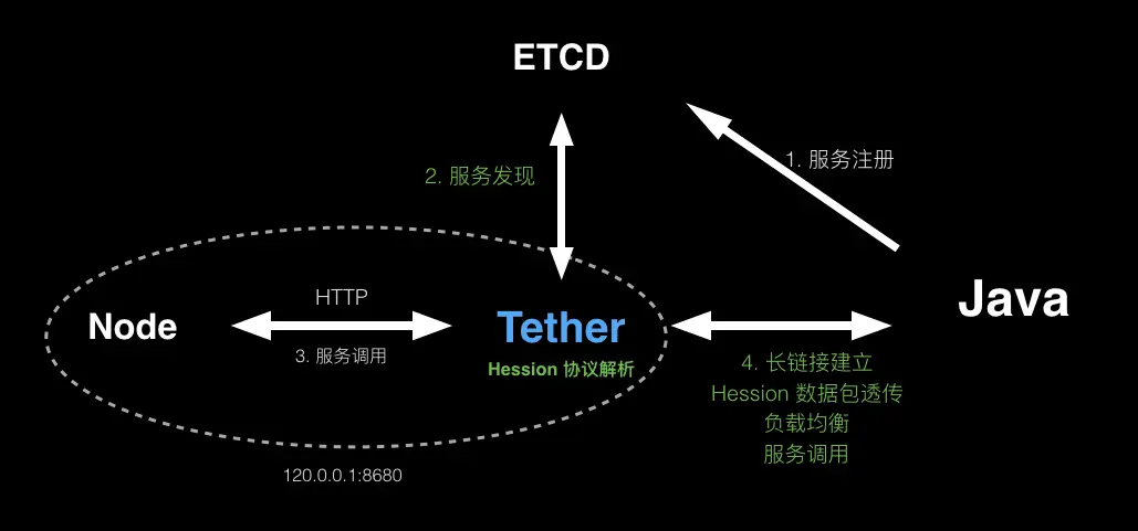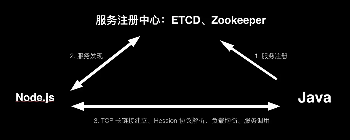 首先,Java 应用服务启动的时候,会往服务注册中心注册服务,这里的服务注册中心可能是 ETCD 或者 Zookeeper,然后,Node 应用在启动的时候,会先从服务注册中心拉取服务列表,接着 Node 会跟 Java 服务建立一条TCP长链接,除此之外,Node 还需要负责 Hession 协议解析以及负载均衡等。