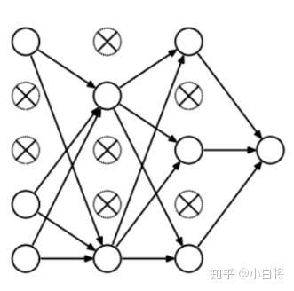Dropout的原理很简单:在每个迭代过程中,随机选择某些节点,并且删除前向和后向连接,如下图所示:
