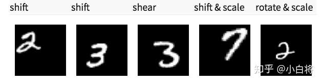减少过拟合的最简单方法是增加训练样本。在机器学习中,由于标注数据是昂贵的,我们不能够增加训练样本数量。但是对于图像问题,有几种可以增加训练样本的方法-旋转(rotaing)、翻转(flipping)、放缩(scaling)及平移(shfiting)等。下面为在MNIST数据集上的一些图像变换: