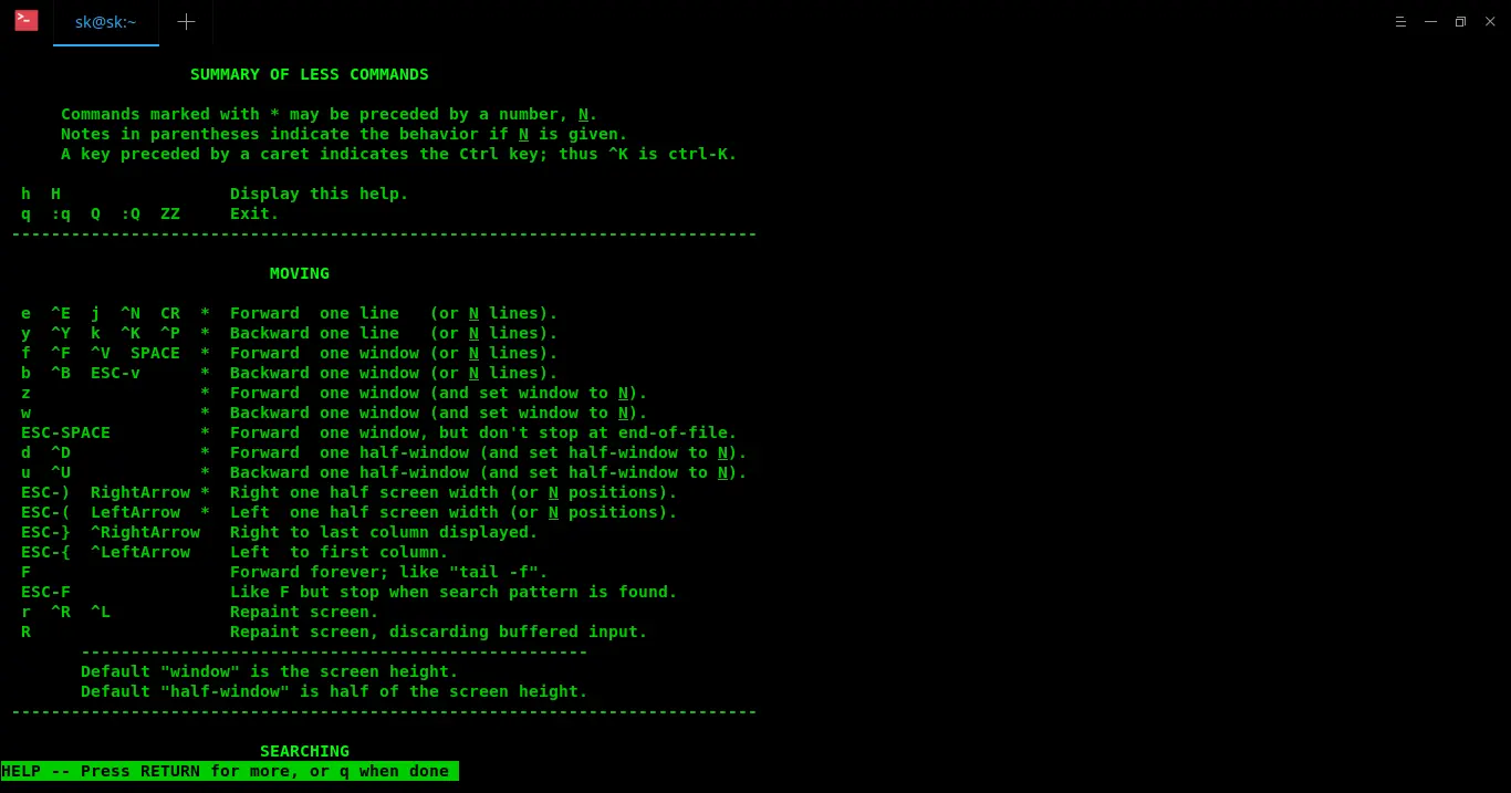 可以使用 空格,d,b 以及上下箭头等来浏览 man 页。要跳转道 man 页的末尾,可以按 End 键而想跳转到 man 页的头部则可以按 Home 键。在当前打开的 man 页中按下 h 键会显示所有有用的键盘快捷键和一般用法。(LCTT 译注:这些快捷键其实是 man 所使用的 less 分页器的快捷键)
