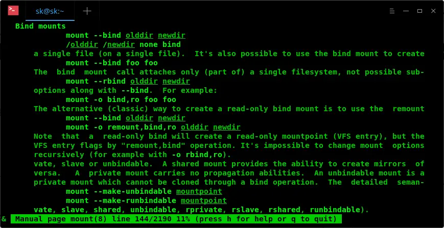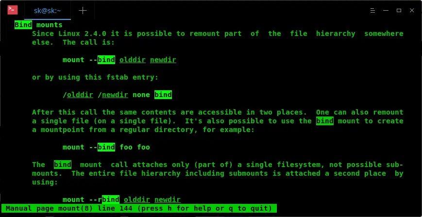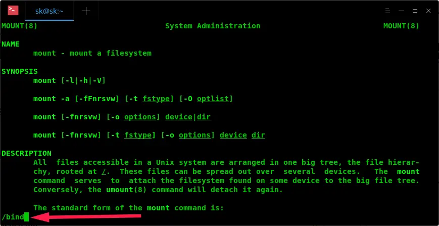 假设你正在查看 mount 命令的 man 页,想要寻找关于 -bind 选项的相关信息。可以输入: