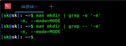 这个命令会显示出 mkdir 命令 man 页中第一次出现 -m 时的内容。从上面命令中我们可以看到 -m 表示的是 “MODE”(chmod)。