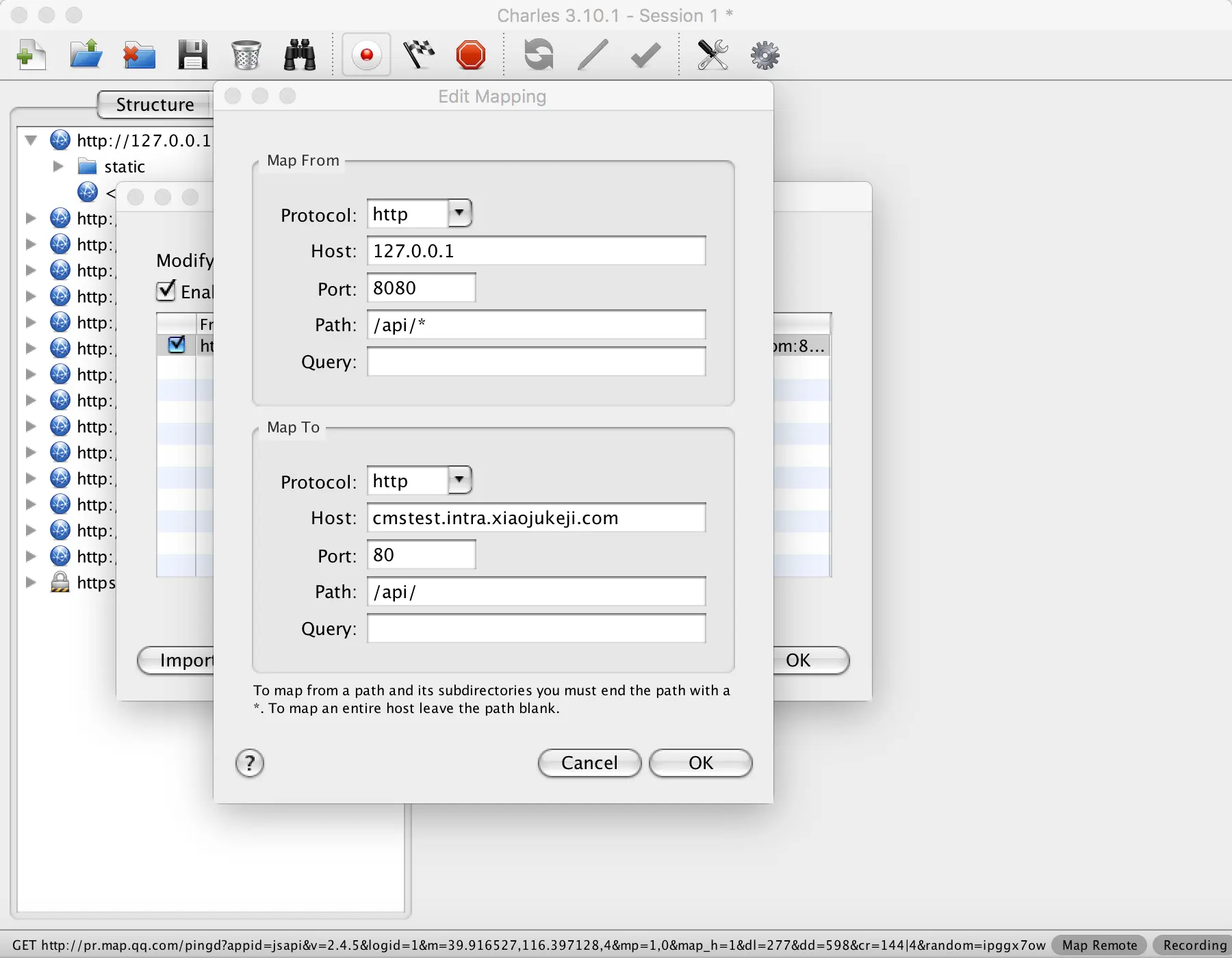 map From中的Path配置项使用了*通配符,表示匹配127.0.0.1:8080/api/下的所有文件及子路径,将其重定向到cmstest.intra.xiaojukeji.com下的/api/路径下