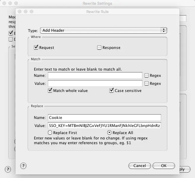 如下图,在本地开发时,需要的某个环境中的数据api接口需要当前登录用户的登录信息的cookie,本地环境没有这些cookie,这时就需要添加需要cookie头,如下图所示,为匹配的接口添加cookie相关的header: