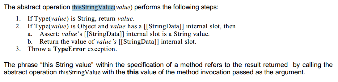 首先看 String.prototype.valueOf() 方法,规范中指出返回的值是抽象操作符 thisStringValue(value) 的返回值,而 thisStringValue(value) 的处理过程是这样子的: