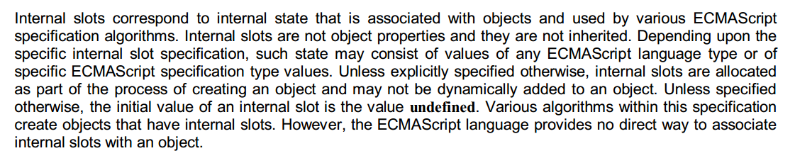 大致意思是说 internal slots 不是对象的属性,不会被继承,初始值都是未定义的。那就可以初步认为 internal slots 是一个类似于属性但是不能被直接获取的值,同时StackOverflow上也有人出来解释这个问题 What is an “internal slot” of an object in JavaScript?