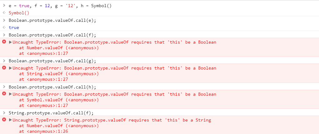 在这里我们假设调用的都是该定义的方法的类型,如调用Boolean.prototype.valueOf() 方法的一个布尔类型的值。