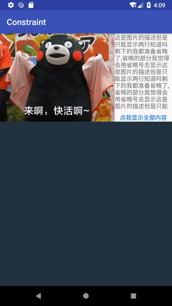 记得我上面说过如果你在竖直或者水平方向上有外边距的话,居中位置会有偏差吗?上面的代码就是重新设置的相应的外边距为0,然后把三个控件同时居中!最后调用了applyTo就能实现开头说的那个动画了!是不是很简单,如果你像还原的话,那么开始创建的两个快照就起到作用了,因为之前已经记录的相应的快照,所以这里直接调用resetConstraintSet.applyTo(mConstraintLayout);就能直接还原了!这里有个问题,如果你不添加TransitionManager.beginDelayedTransition(mConstraintLayout);的话,位移是有的,但是十分的生硬,但是这个方法是在API19以上才生效的,所以这里我做了相应的判断!!!