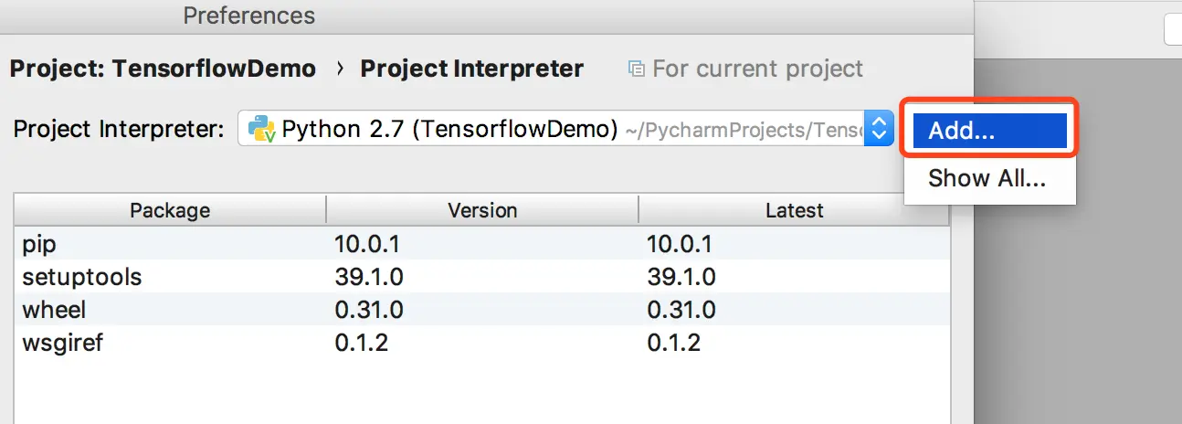 Preferences菜单,选择对于的项目的选项Project Interpreter,