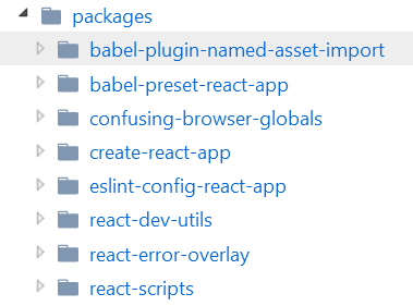 如上图,大部分文件我们都不需要关注,是一些工具(如eslint,travis,yarn,appveyor,lerna)的配置文件,说明文件等等,我们只需要关注packages和package.json(项目的配置文件),主要的都在packages里,如下图所示,里面有六个文件,其中webpack的配置,eslint的配置,babel的配置等就不需介绍了,这里只需要关注create-react-app和react-scripts,另外react-dev-utils里面的源码也非常有用,它主要是设计webpack插件的编写。create-react-app是一个全局的命令行工具用来创建一个新的项目,react-script帮我们写好了项目所需要的开发依赖和配置文件中的配置属性,比如react-scripts已经自动下载需要的webpack-dev-server依赖,然后react-scripts自己写了一个node服务端的脚本代码start.js来实例化webpackDevServer,并且运行时启动了一个express的http服务器,我们只需要专注写源码即可了。即create-react-app主要是初始化目录和依赖,其中控制环境的代码都在react-scripts中,这里先介绍create-react-app的源码,react-scripts和react-dev-utils的源码分析放在下一篇文章中。