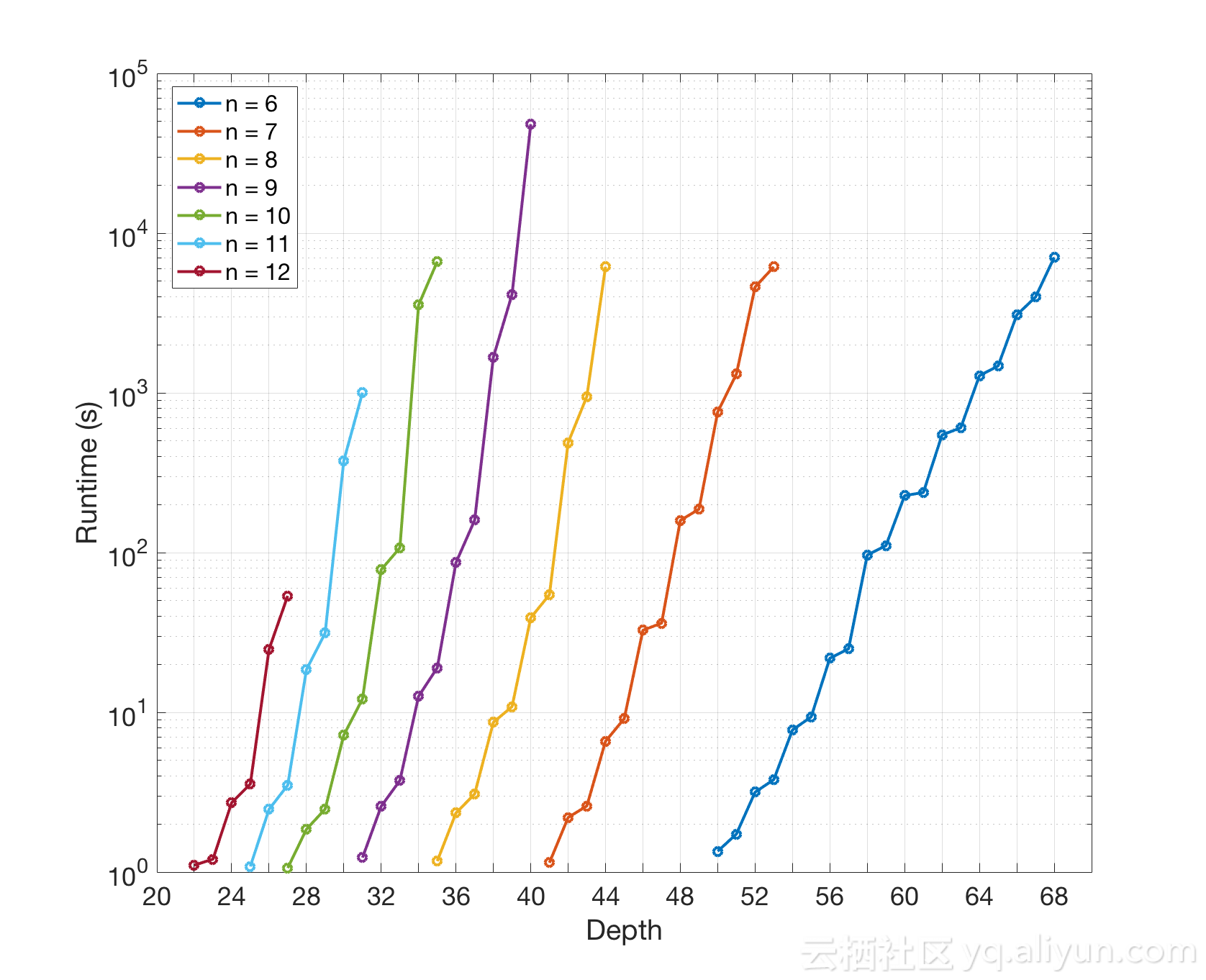 nxn二维网格上,计算随机电路输出每一个振幅的执行时间与电路深度的对应关系
