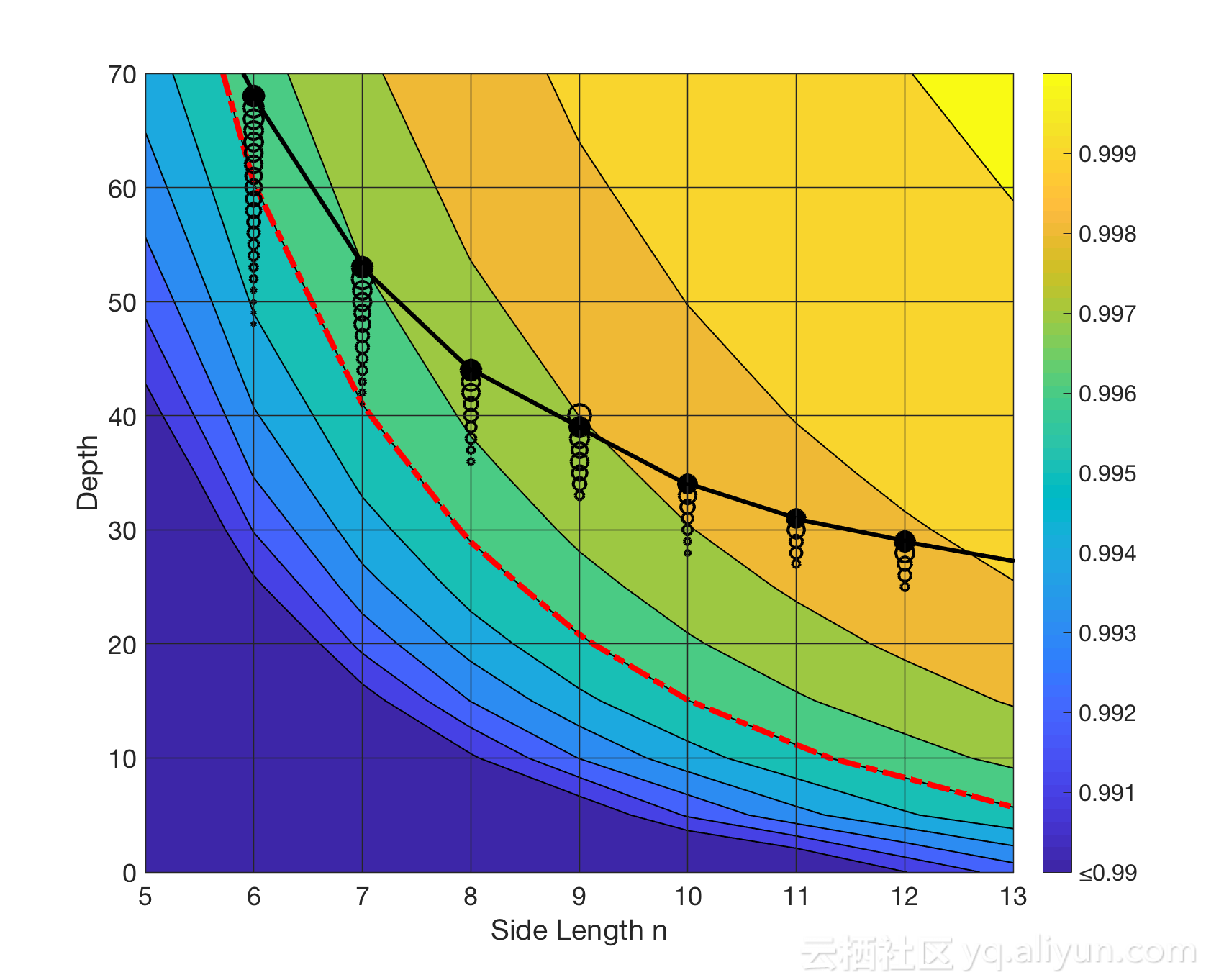 “太章”模拟的随机量子电路规模(黑线)与谷歌量子硬件可以实现的规模(红线) 比较(基于谷歌在[Characterizing quantum supremacy in near-term devices]中对7x7的估计)*