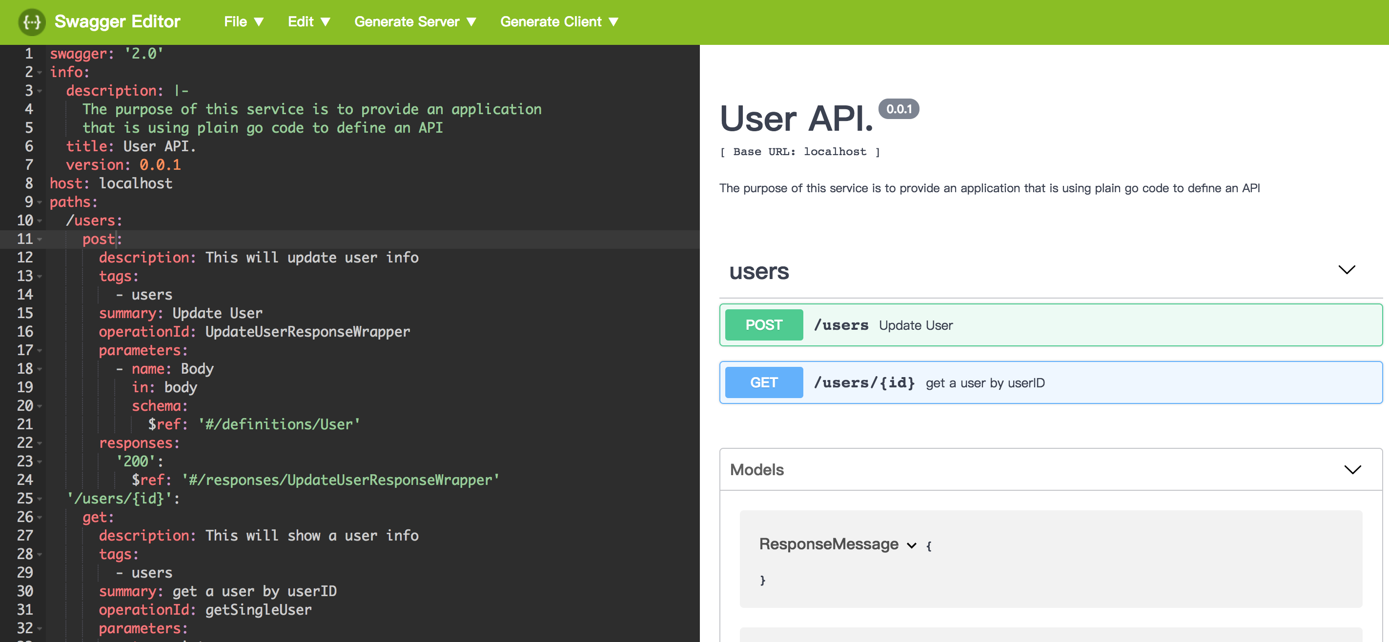 然后浏览器访问localhost,查看swagger-editor界面,点击工具栏中的File->Impoprt File上传刚才生成的 swagger.json文件,就可以看到界面: